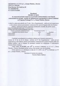 Rezultatele desfășurării selecției dosarelor candidaților care au solicitat înscrierea la concursul pentru ocuparea pe perioadă nedeterminată a unei funcții contractuale de execuție vacante de ADMINISTRATOR PATRIMONIU, în cadrul Gradiniței cu Program Prelungit Nr. 1 ”Căsuța Piticilor”, Horezu, realizată în data de 22.10.2025, sunt următoarele: