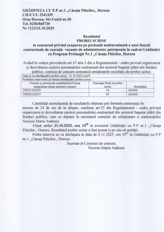 Rezultatul PROBEI SCRISE la concursul privind ocuparea pe perioadă nedeterminată a unei funcții contractuale de execuție vacante de administrator patrimoniu în cadrul Grădiniței cu Program Prelungit Nr.1 ”Căsuța Piticilor”, Horezu