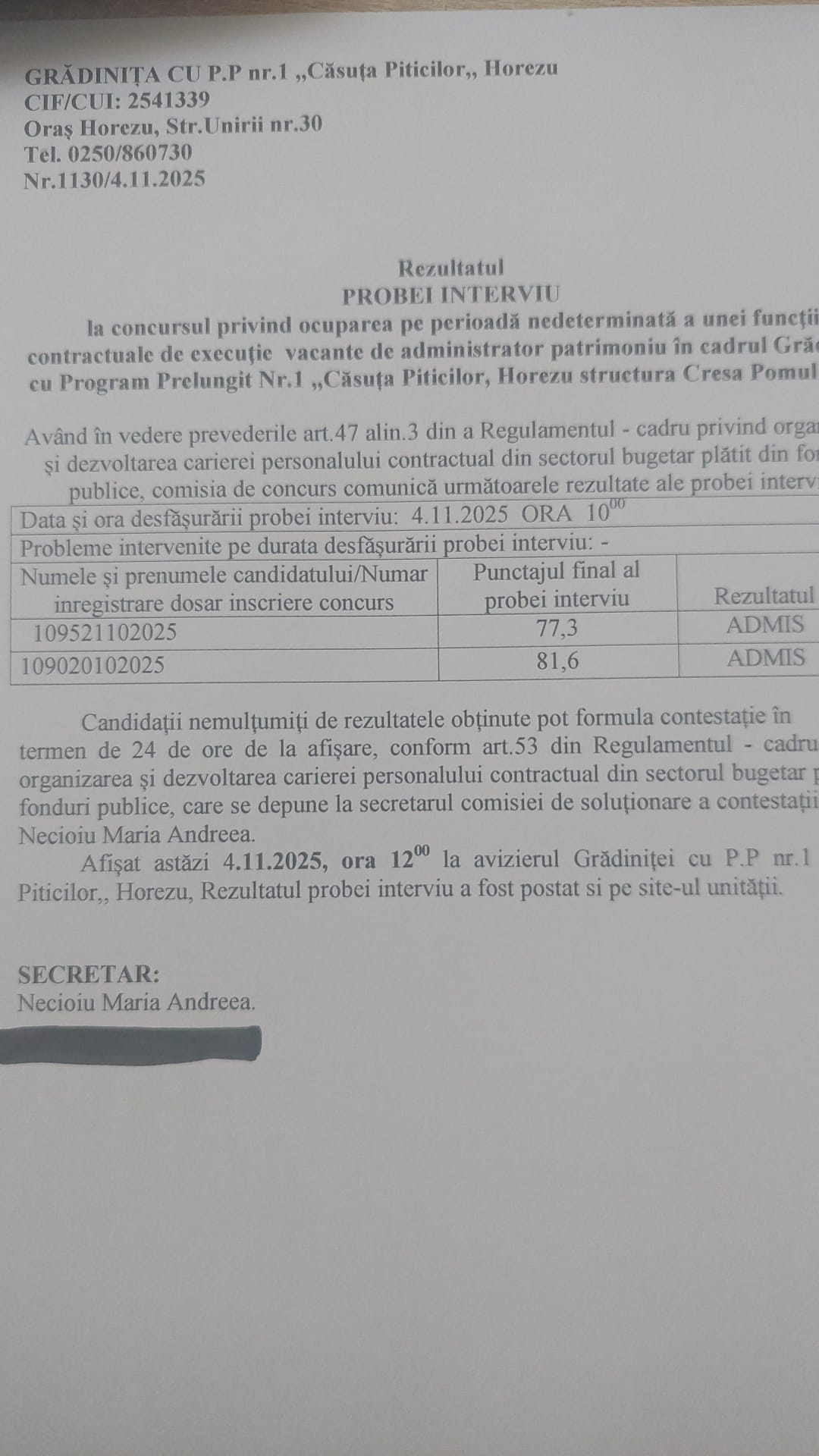 Candidații nemultumiți de rezultatele obținute pot formula contestație în termen de 24 de ore de la afișare, conform art.53 din Regulamentul-cadru privind organizarea și dezvoltarea carierei personalului contractual din sectorul bugetar plătit din fonduri publice, care se depune la secretarul comisiei de soluționare a contestațiilor, Necioiu Maria Andreea.