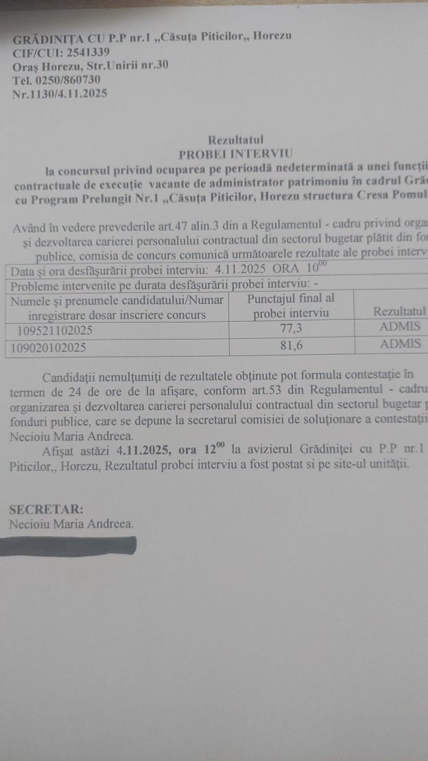 Rezultatul PROBEI INTERVIU la concursul privind ocuparea pe perioadă nedeterminată a unei funcţii contractuale de execuţie vacante de administrator patrimoniu în cadrul Grădiniței cu Program Prelungit Nr.1 ”Căsuța Piticilor”, Horezu, structura ”Cresa Pomul Vieții”.
