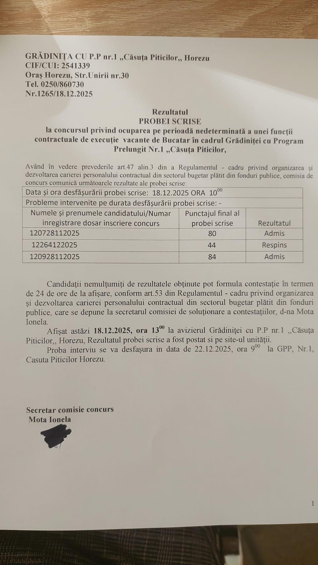 Afişat astăzi 18.12.2025, ora 1300 la avizierul Grădiniței cu P.P nr.1 „Căsuța Piticilor,, Horezu, Rezultatul probei scrise a fost postat si pe site-ul unității.